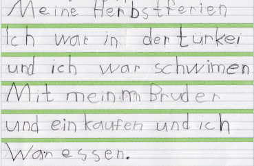 ![]() Meine Herbstferien Ich hatte Geburtstag und ich habe sehr viel bekommen. Ich war schwimmen. Ich war bei McDonalds gewesen und ich war in der GRUGA und ich war auf dem Spielplatz und ich bin vom Klettergerüst gefallen. |